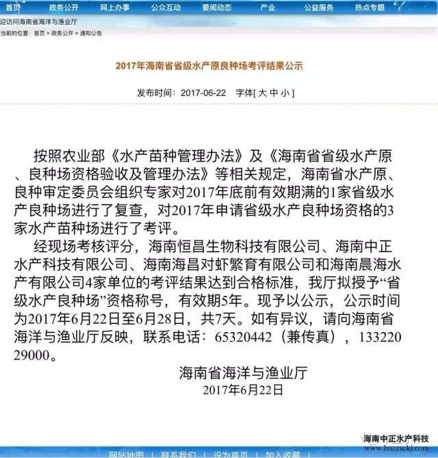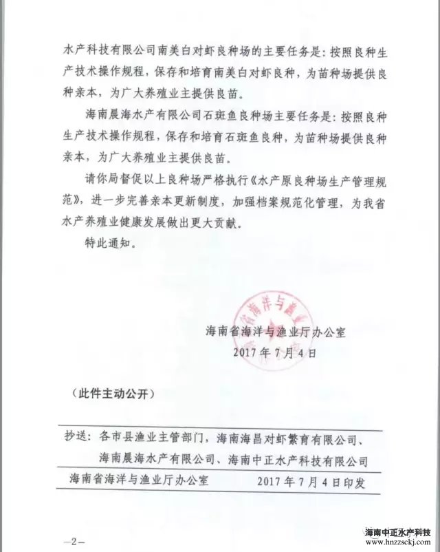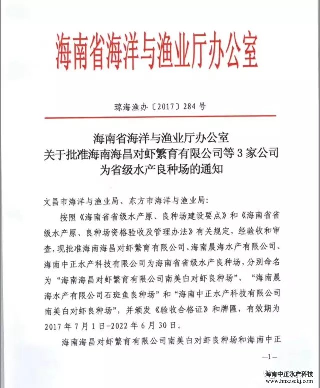 2017年7月4日,海南省海洋與漁業(yè)廳辦公室正式下發(fā)通知,批準(zhǔn)海南中正水產(chǎn)科技有限公司為海南省省級(jí)水產(chǎn)良種場(chǎng),命名為“海南中正水產(chǎn)科技有限公司南美白對(duì)蝦良種場(chǎng)”!